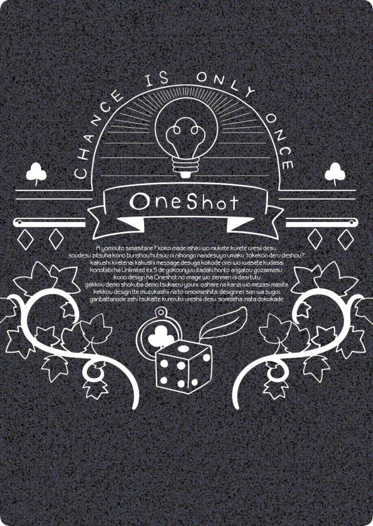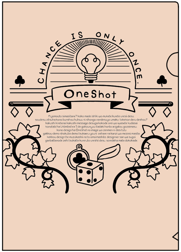 2019年12月8日 UNLIMITED EX 5 青海B メ-45b【三毛寝小屋】 Oneshotモチーフクリアファイル&下敷き アリスブックスさんにて委託販売中です! ジャンル:海外ゲーム(Oneshot)仕様:A4クリアファイル 違いの同一デザインです。プライベートはもちろん、職場や学校など、場面を意識せずに使えるデザインにしました。 アリスブックスさんにて委託販売中です! ジャンル:海外ゲーム(Oneshot)仕様:B5 0.5mmPET 片面カラー 下敷きとしての利用はもちろん、アートボードとしてお部屋のインテリアにもどうぞ。 Oneshot限界考察 アリスブックスさんにて委託販売中です!在庫なし MIKE-010ジャンル:海外ゲーム(Oneshot)仕様:同人誌(コピー本・A5)/論文・レポート Oneshot世界におけるあらゆる謎を独自の視点から考察を行ったレポートですという名目で真剣にふざけました